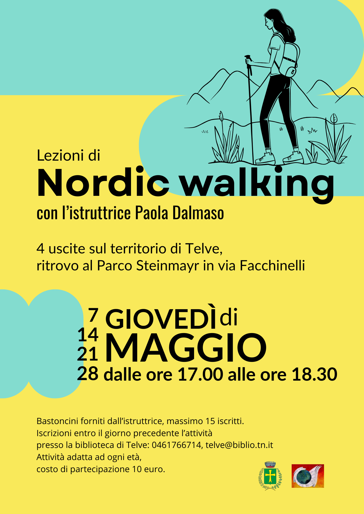 Quattro lezioni di Nordic Walking con l'istruttrice Paola Dalmaso che si terranno tutti i giovedì del mese di maggio (7,14,21 e 28) nel territorio di Telve con partenza dal parco Steinmayr, in via Facchinelli, dalle ore 17.00 alle ore 18.30. In caso di maltempo sarà possibile recuperare venerdì 29 maggio e giovedì 4 giugno. L'attività è rivolta a tutte le fasce d'età ed è a numero chiuso (max 15 persone ad uscita) pertanto è prevista l'iscrizione da effettuarsi presso la Biblioteca comunale entro il giorno precedente l'evento. La quota di partecipazione è di 10 euro, sia che si partecipi ad una o a tutte le date previste. Si raccomanda abbigliamento sportivo e per chi non fosse in possesso di bastoncini, possono essere forniti dall'istruttrice.