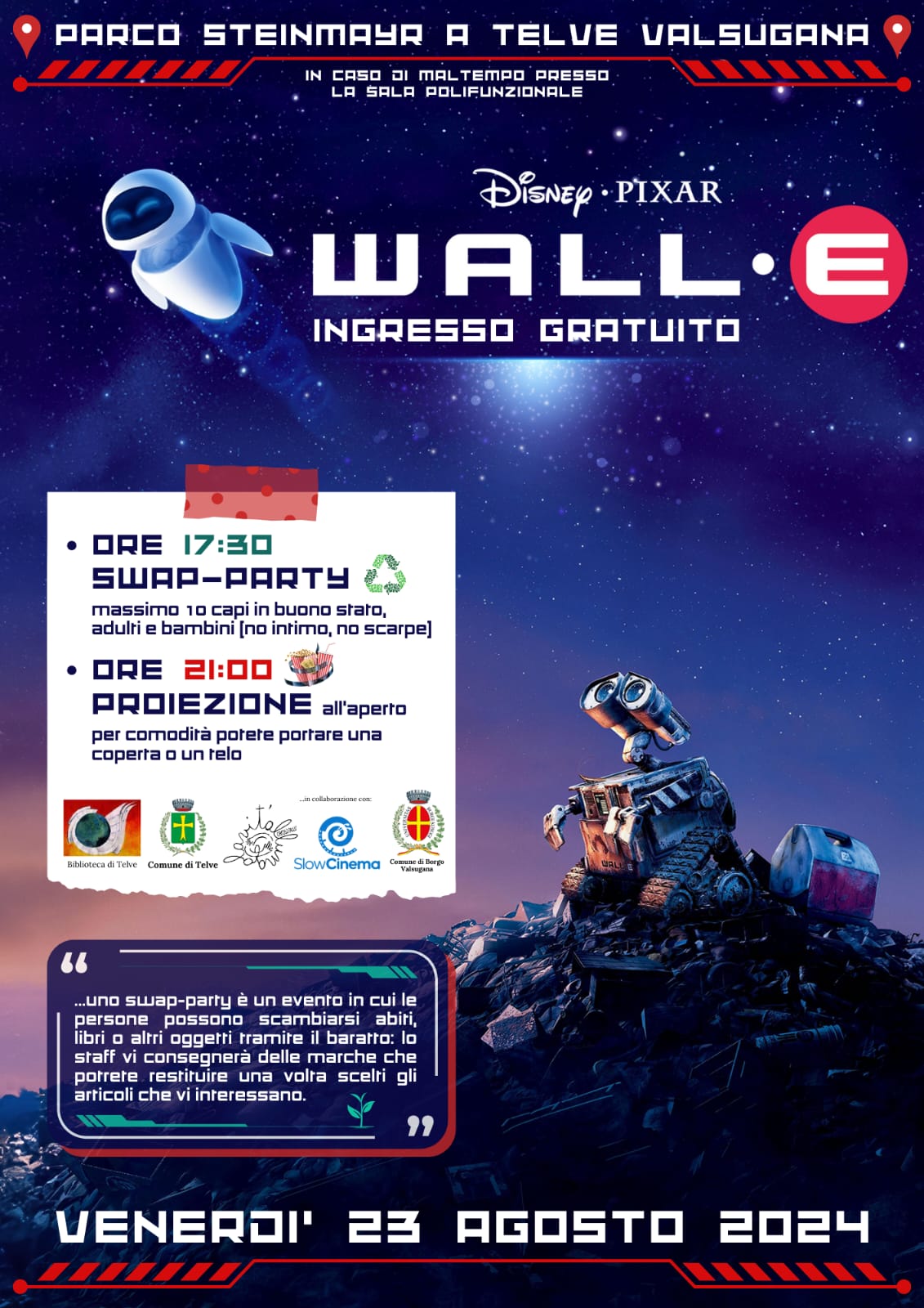 Ore 17.30 - Swap Party: evento in cui le persone persone possono scambiarsi abiti, libri o altri oggetti tramite il baratto: lo staff vi consegnerà delle marche che potrete restituire una volta scelti gli articoli che vi interessano. [massimo 10 capi in buono stato, adulti e bambini (no intimo, no scarpe)]. Ore 21.00 - Seguirà Proiezione all'aperto del cinema WALL-E