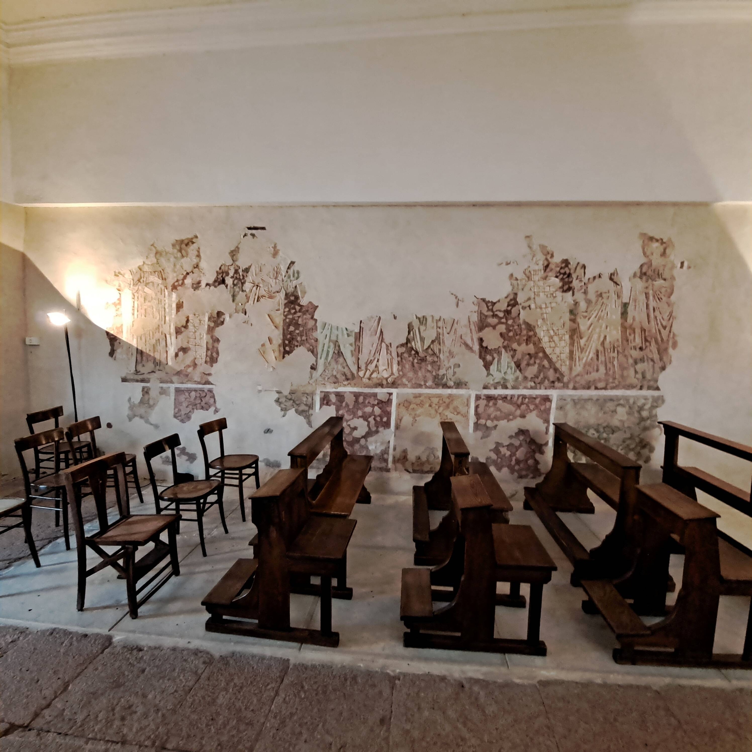 Originariamente era un’unica aula rettangolare con sopra la croce di ferro ancora visibile.